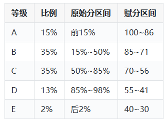每个等级对应固定的赋分区间,满分100分,起点分30分: