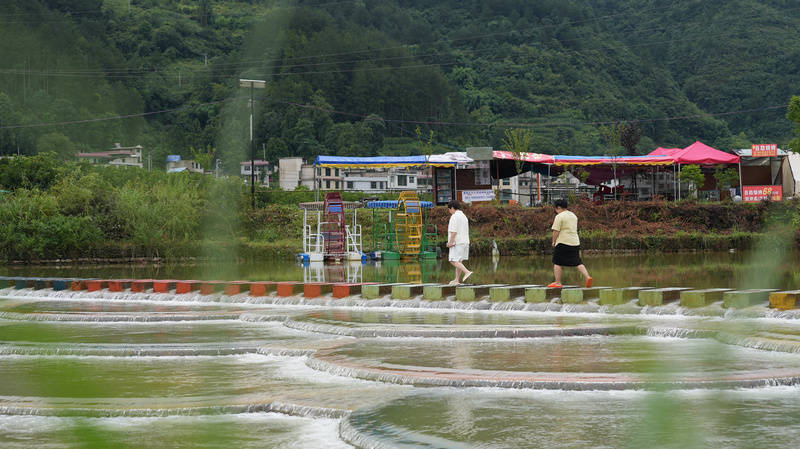 游客行走在龙里县龙山镇余下村鱼鳞坝。