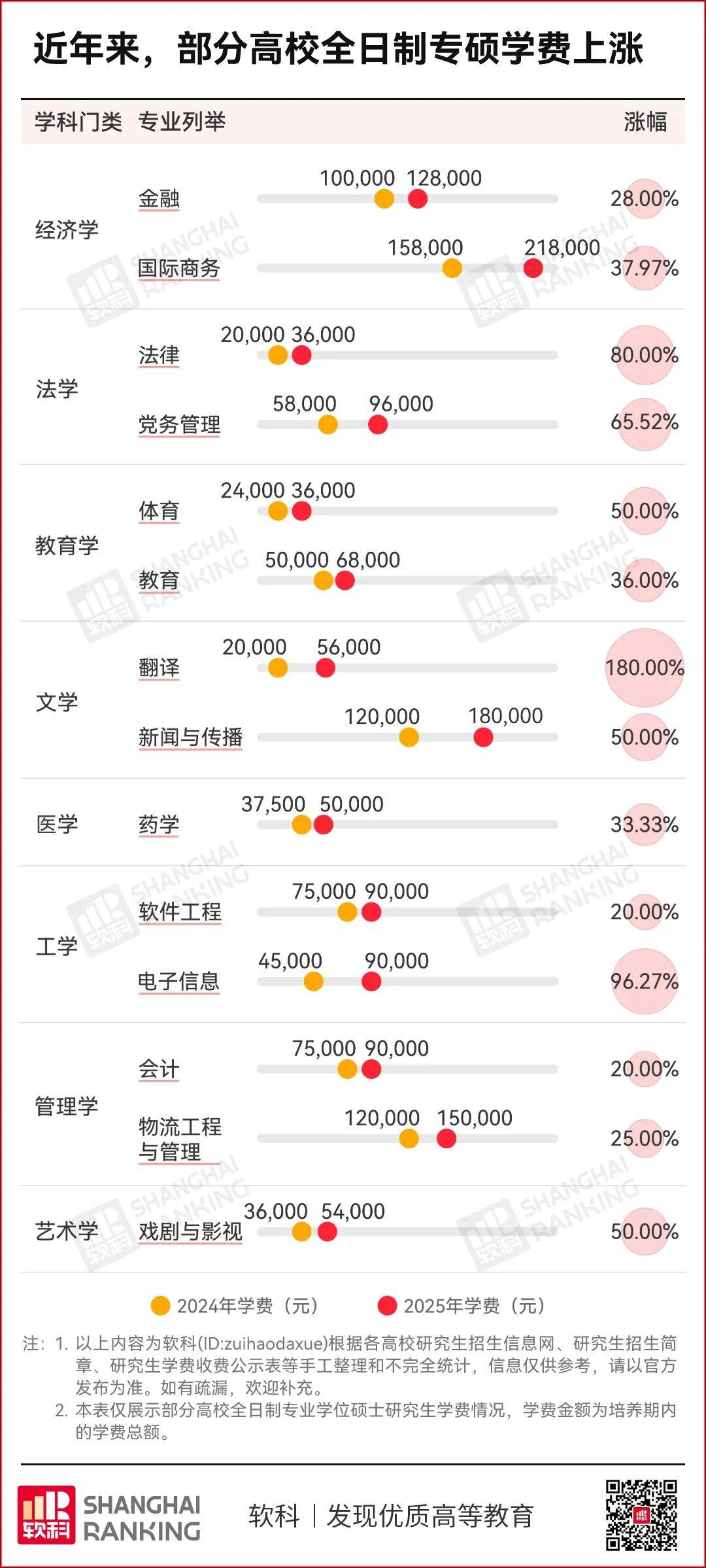 软科梳理了部分高校2024年和2025年研究生收费标准,发现学费上调的“重灾区”集中在经济学、管理学类专业,法学、文学、工学等门类下的专业皆出现不同程度的增长,其中也不乏热门专业。