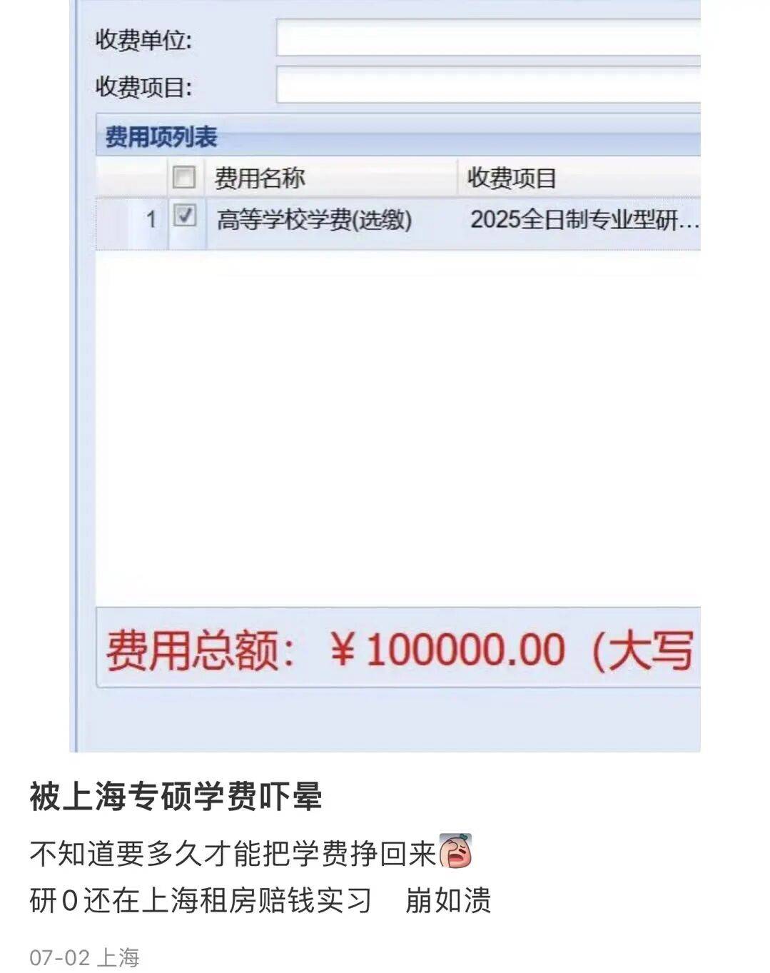 无独有偶。还有一位即将攻读某985高校全日制应用统计硕士专业学位的网友,在社交平台晒出自己研究生一年学费的截图,显示共需缴费10万元。