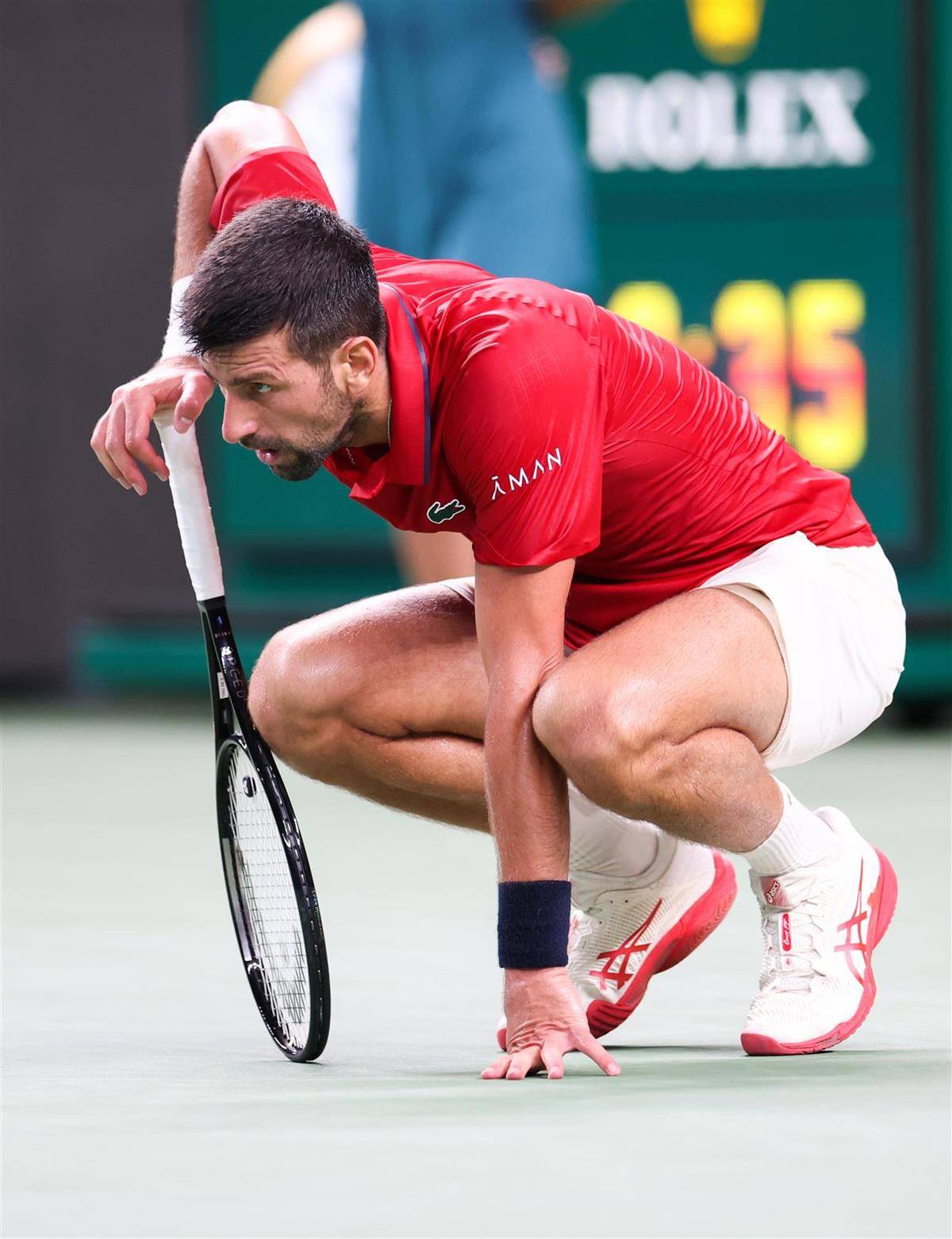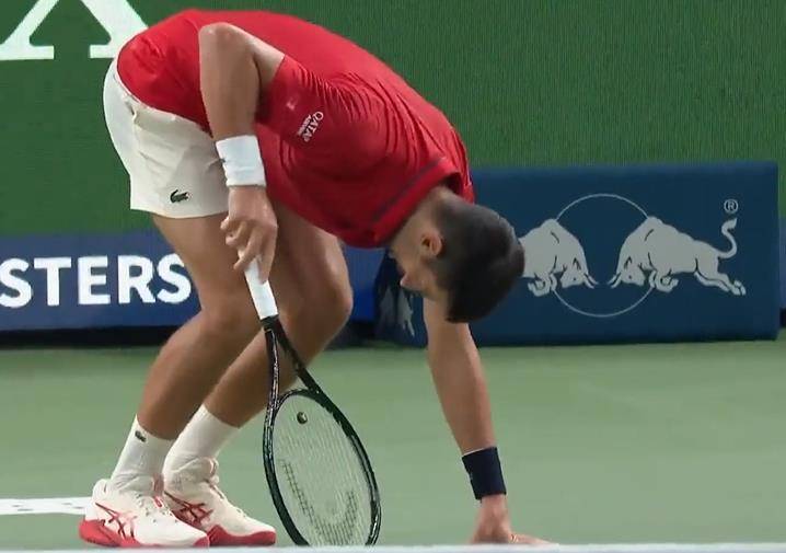 德约科维奇的腿上贴着肌贴,在第7局中,他在接球时突然摔倒,引发全场一片惊呼。医疗暂停未能解除他身体上不适,他的腿已经不那么灵活。德约科维奇在第8局失去了自己的发球局,他的表情里交杂着懊恼与不甘。