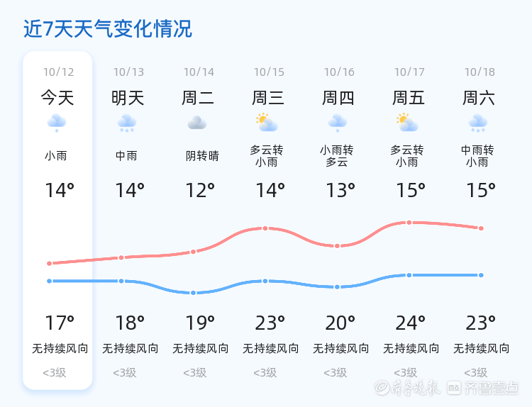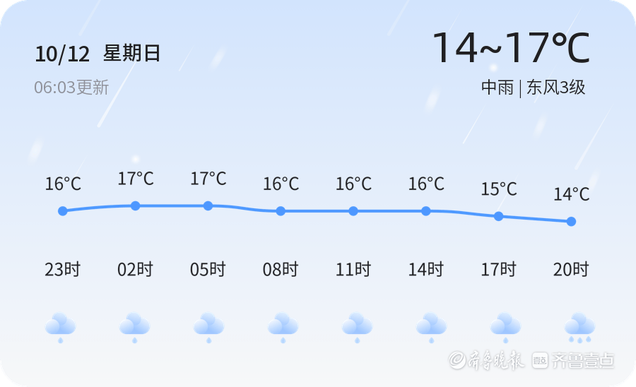 今天是10月12日,星期日,农历八月廿一。泰安市迎来中雨天气,全市各区普遍降雨,气温介于14℃至17℃之间,东风3级,空气湿度达到98%,PM2.5指数为10,空气质量良好。市民出行需携带雨具,注意防寒保暖。