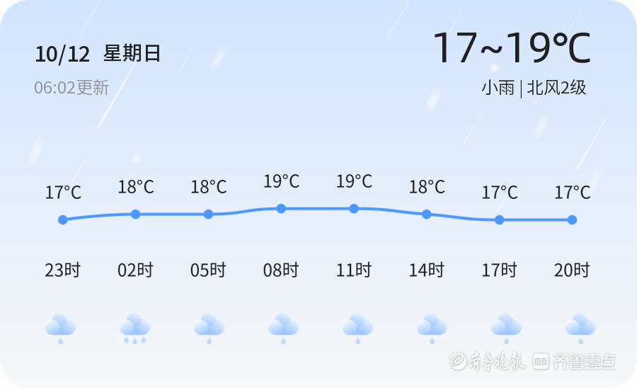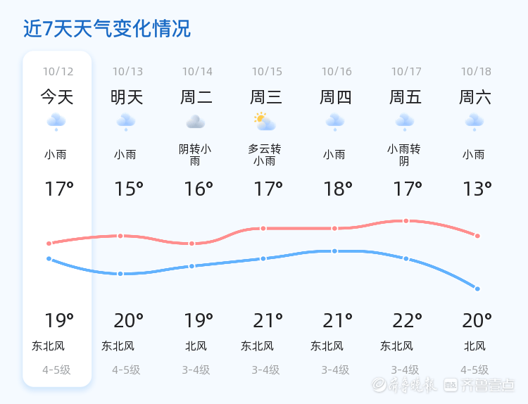 今天是10月12日,农历八月廿一,星期日。烟台市迎来小雨天气,全市各区普遍出现降雨,气温在17℃至19℃之间,北风2级,空气湿度高达95%,PM2.5指数为23,空气质量优良。市民出行需携带雨具,注意防寒保暖。