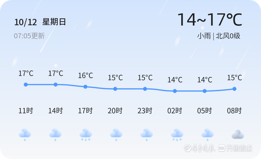 今天是10月12日,星期日,农历八月廿一。潍坊市迎来小雨天气,气温在14℃至17℃之间,北风0级,空气湿度100%,空气质量状况为优(PM2.5指数23)。市民出行请注意携带雨具,雨天路滑,驾车请减速慢行,确保行车安全。