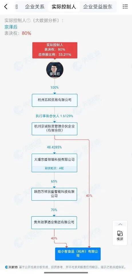 天眼查APP显示,娃小智食品(杭州)有限公司成立于今年1月13日,股东为贵州娃茅酒业集团有限公司、杭州宗诚投资管理合伙企业(有限合伙)、杭州星光城市发展集团有限公司,持股比例分别为40%、40%、20%。经过股权穿透,娃小智食品(杭州)有限公司的实际控制人为宗泽后。