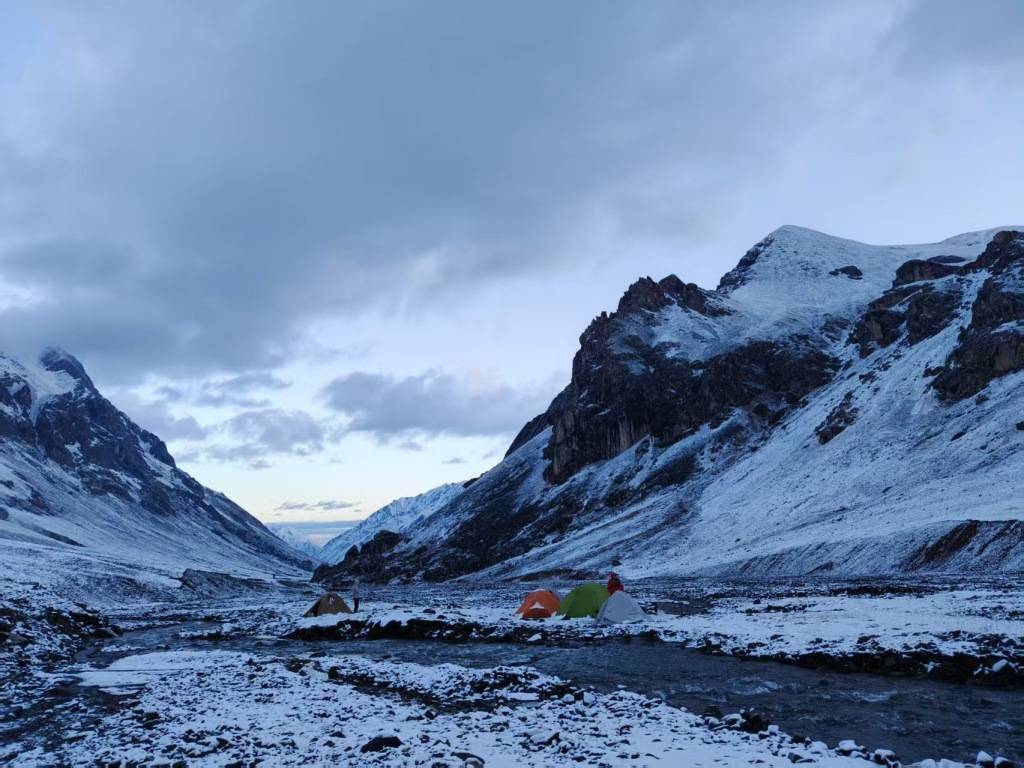 10月5日早上,营地开始下雪,秦媛看到又有部分徒步者下撤返回。他们7人决定继续徒步。领队考虑到秦媛与另外一名女生行走较慢,所以分为两个小组,能够更周全地照顾到每一位队员。