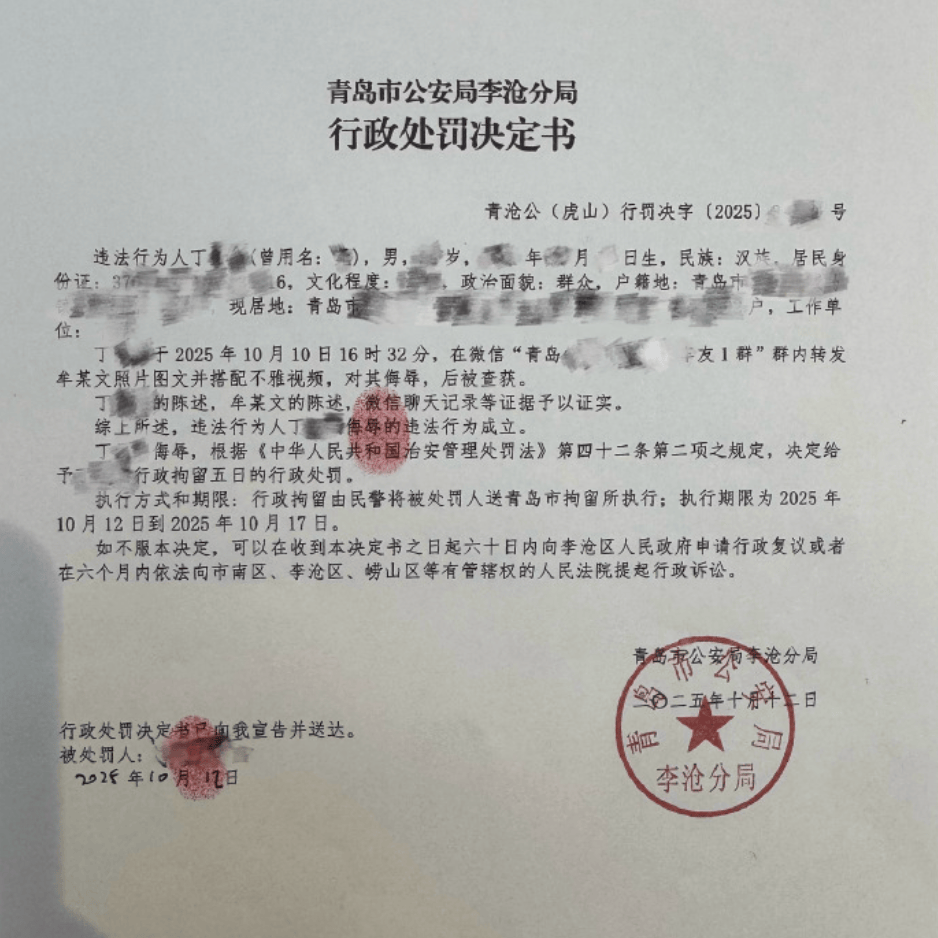 行政处罚决定书显示,一男子在群内转发牟某文照片图文并搭配不雅视频,对其侮辱,后被查获。根据《中华人民共和国治安管理处罚法》第四十二条第二项之规定,决定给予行政拘留五日的行政处罚。