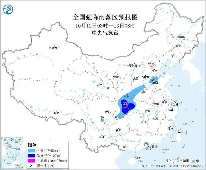 预计,10月12日08时至13日08时,陕西南部、四川东北部、重庆大部、湖北西部、山西南部、河南西部、山东西北部等地部分地区有大到暴雨,其中,重庆北部等地局地有大暴雨(100~120毫米)。
