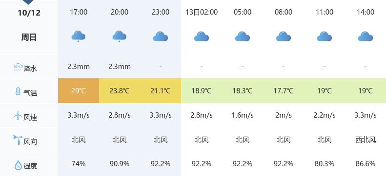 今天是2025年10月12日,咸宁白天天气为小雨,夜间转为阴,最高气温29℃,最低气温17℃,白天微风,夜晚微风,空气湿度96%,体感温度24.2℃。降雨天气路面湿滑,建议出行携带雨具,注意交通安全,避免在低洼路段长时间停留。