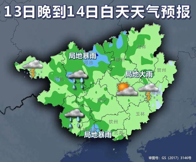 13日晚上到14日白天,桂北、桂西部分地区有中雨、局地暴雨,其它地区多云有阵雨或雷雨、局地大雨。