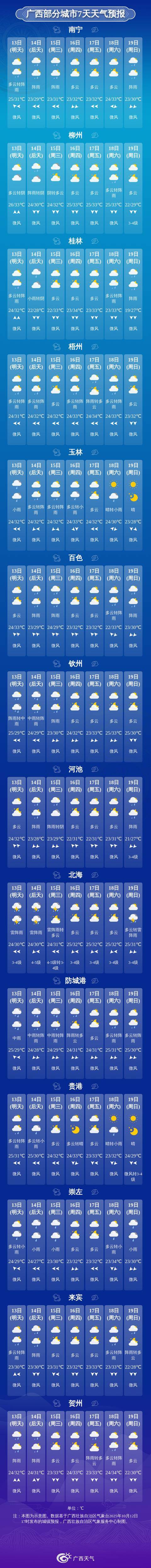 明天白天,崇左、防城港、钦州、北海、玉林、梧州、贵港、来宾、贺州、桂林等市有中雨、局地大雨或暴雨,其它地区多云有阵雨或雷雨、局地大雨。
