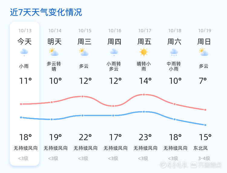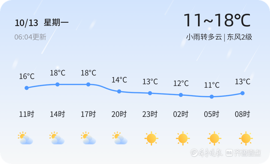 今天是2025年10月13日,农历八月廿二,泰安市迎来了一次小雨转多云的天气过程。今日气温较为温和,最低气温11℃,最高气温18℃,东风2级,空气湿度高达95%,PM2.5指数为15,空气质量优良。全市各区普遍出现小雨天气,随后逐渐转为多云,整体天气状况平稳。