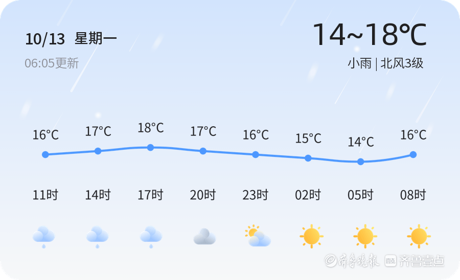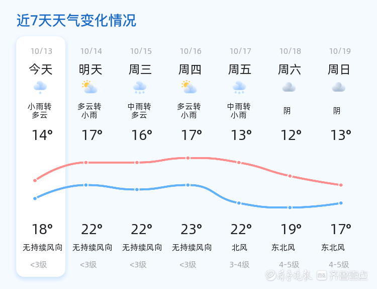 明日(10月14日),日照市天气将有所变化,由小雨转为多云,气温较今日有所上升,最低气温17℃,最高气温22℃。风力依旧较小,无持续风向,市民可适当减少雨具携带,但需关注天气变化。