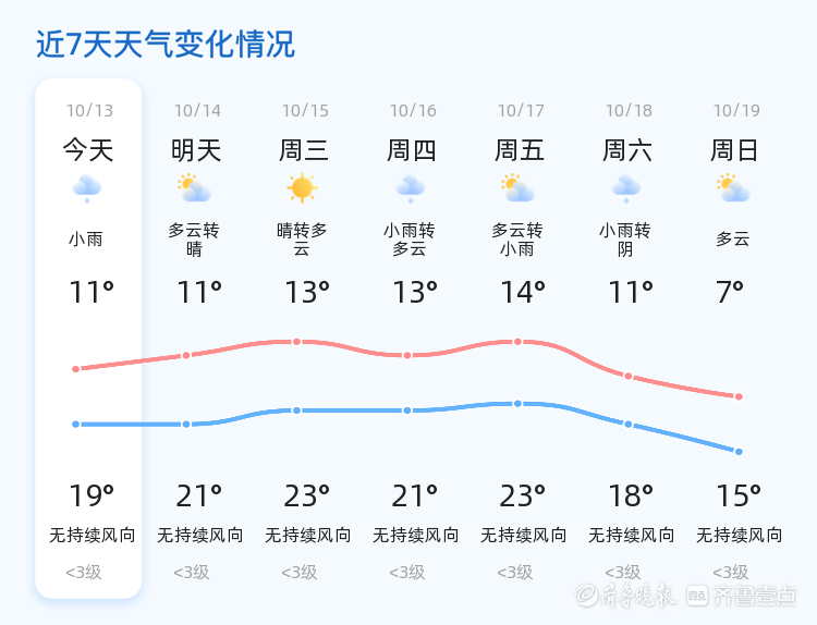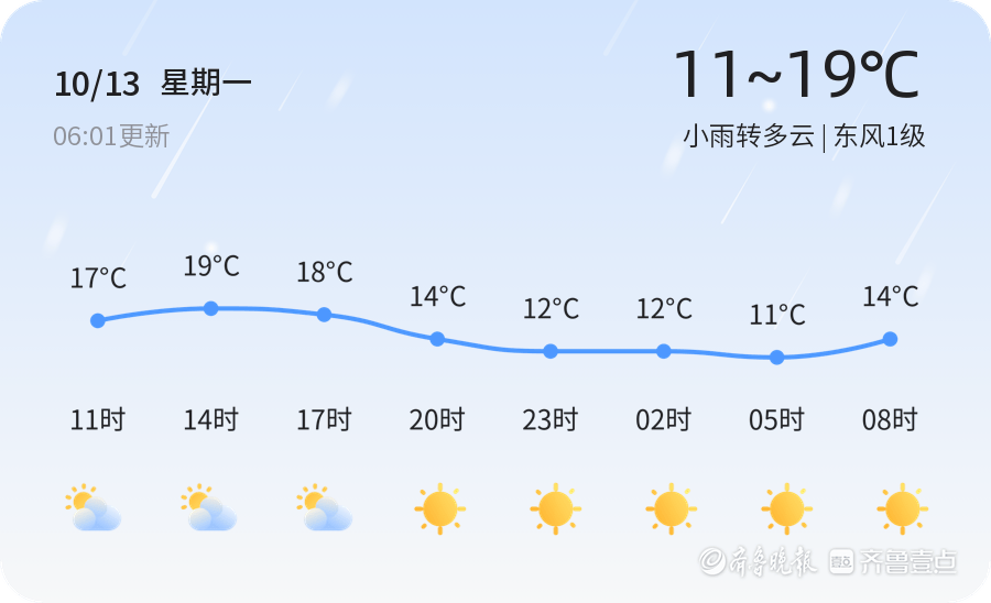 今天是10月13日,星期一,农历八月廿二。淄博市今天天气以小雨转多云为主,气温在11℃至19℃之间,东风1级,空气湿度达到100%,PM2.5指数为18,空气质量良好。各区县天气情况总体相似,市民出行需注意携带雨具,防范小雨带来的路面湿滑。