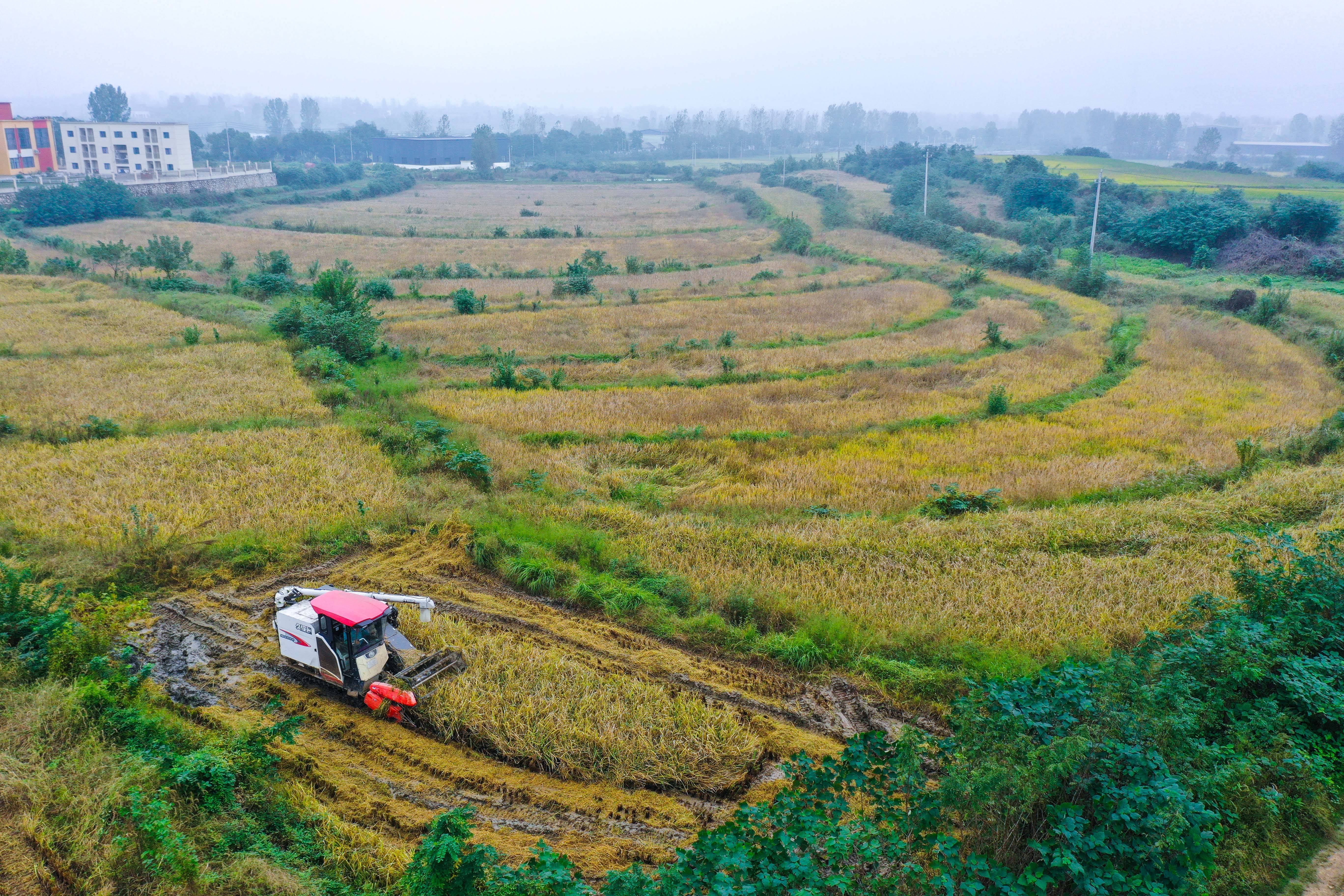 10月12日,在河南省信阳市光山县罗陈乡,收割机在抢收水稻(无人机照片)。 新华社发(谢万柏摄)