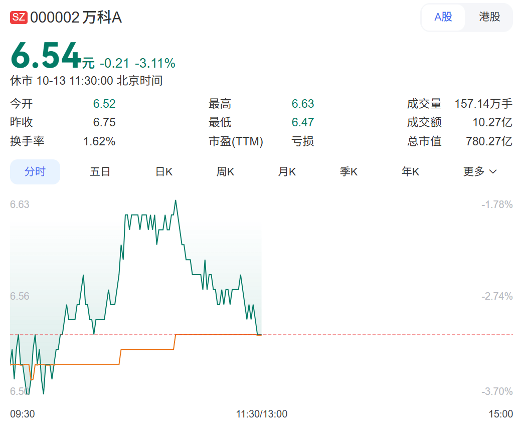 10月13日,万科股价在重大人事变动消息冲击下显著下跌。截至当日午间发稿,港股万科企业低开4.61%后一度跌超6%,最终报4.96港元/股,跌幅4.8%;A股万科A同步低开,跌幅达3.11%,报6.54元/股。
