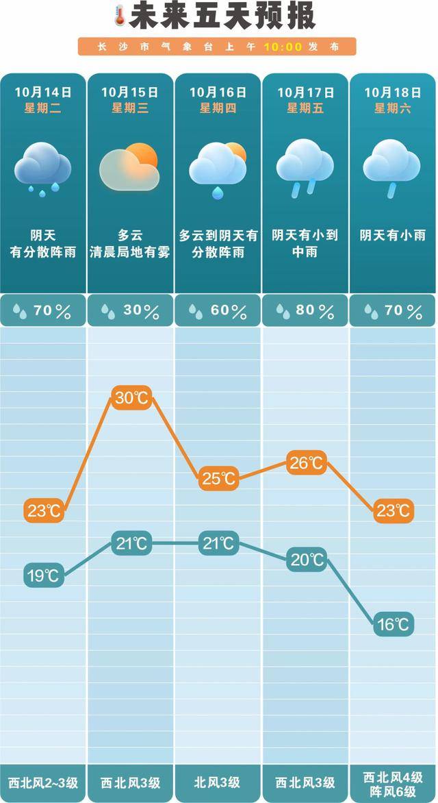 据长沙市气象台预计,13日到14日受冷空气影响,阴天有分散阵雨,西北风3级、阵风5到6级;15日到16日,多云为主,最高气温回升至30℃;17日到19日受新一轮较强冷空气影响,最高气温下降10℃至12℃,西北风加大至4到5级、阵风6到7级,有小到中雨。