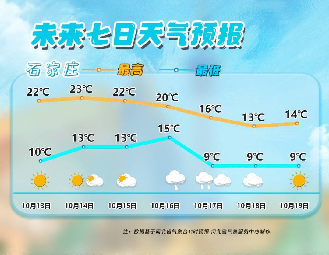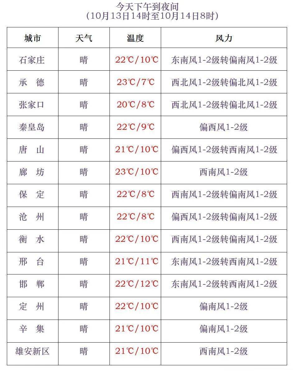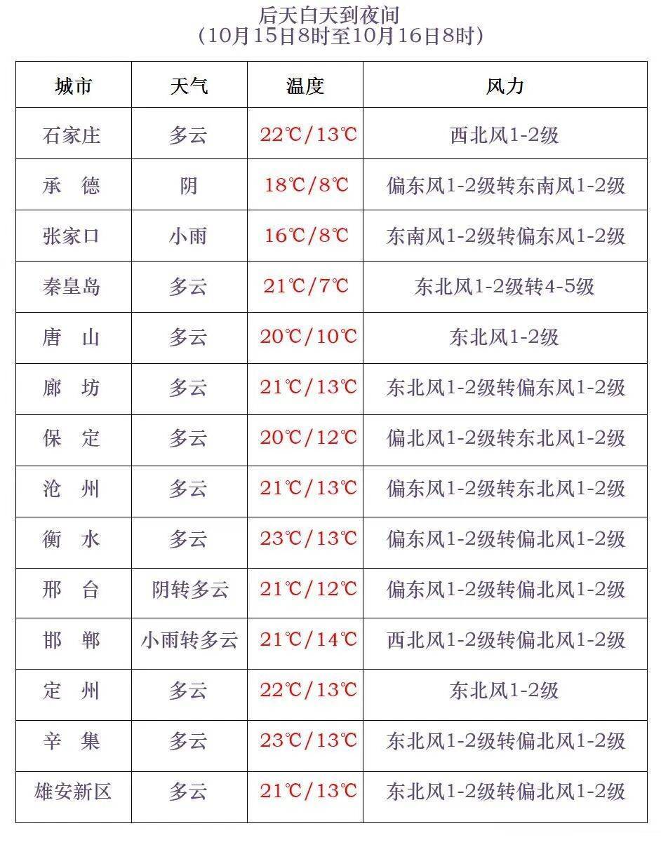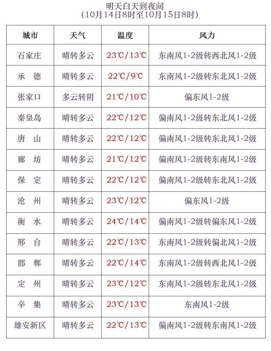 明天夜间到15日,张家口北部、承德北部、邢台东南部、邯郸中东部多云转阴有小雨,其他地区晴转多云。