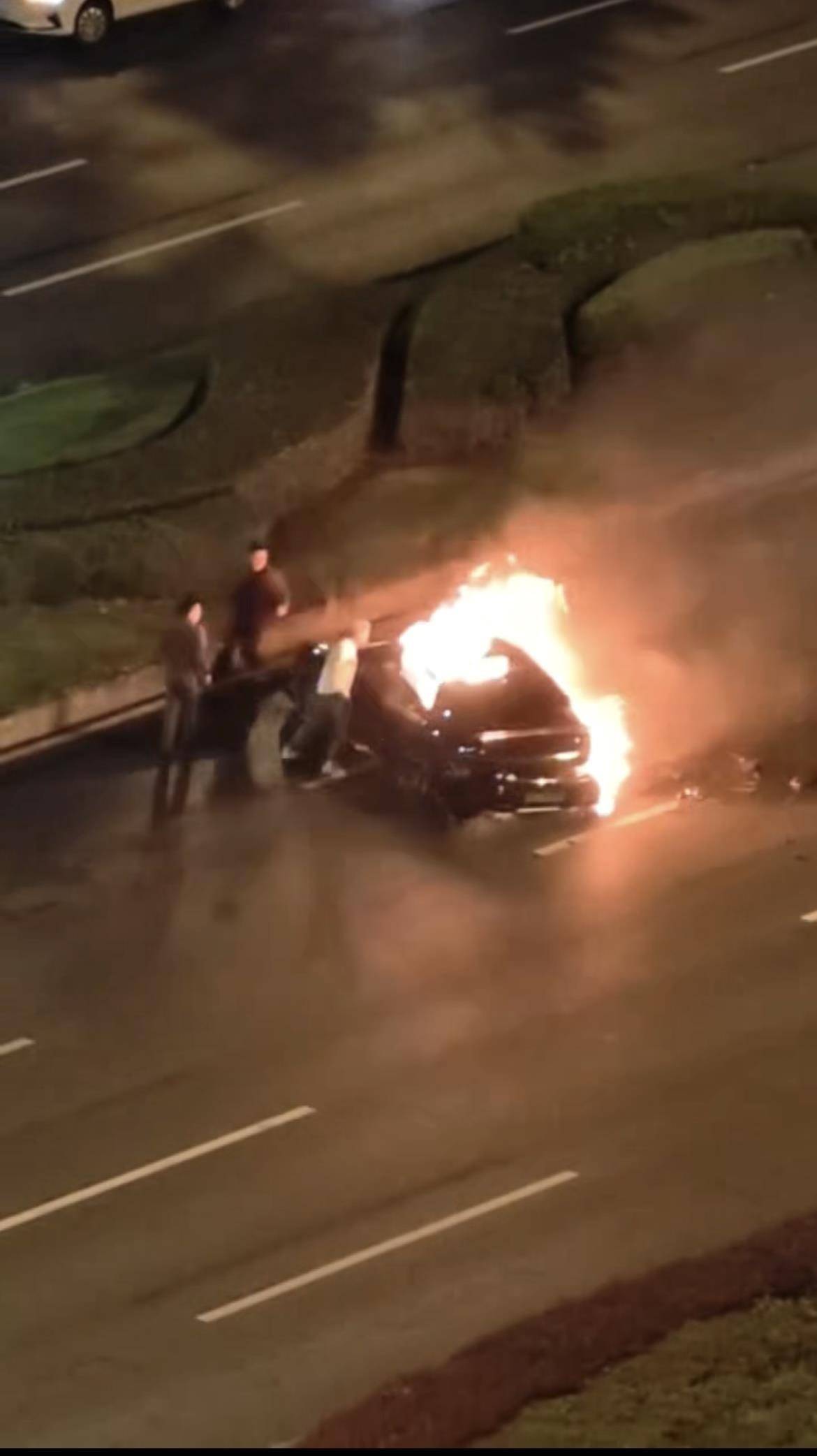 该市民发布的视频中可见,小车车头对着路边花坛,一侧火势很大,多名路人参与救援,有人试图拉门,有人用脚踹门,有人拿来车载灭火器,还有一名白衣男子急得徒手猛砸车窗,但均没有成功。大火随即蔓延到全车。