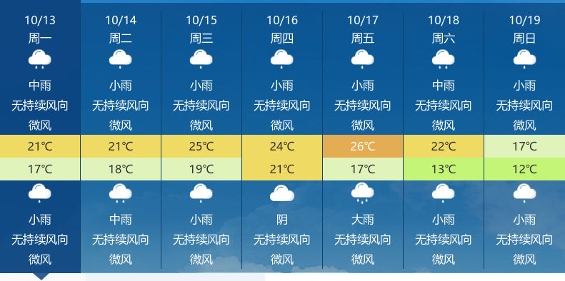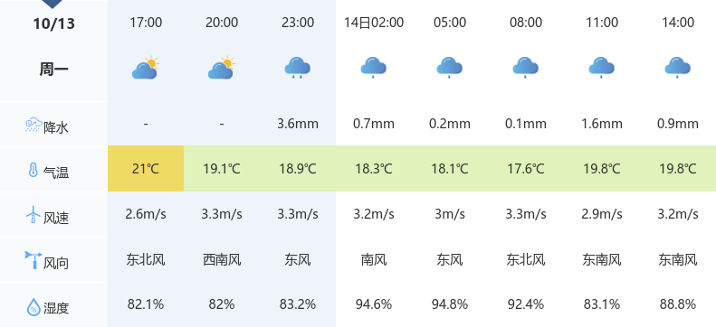 今天是2025年10月13日,恩施白天天气为中雨,夜间转为小雨,全天微风,最高气温21℃,最低气温17℃,空气湿度93%,体感温度22.0℃,空气质量优。雨天路面湿滑,出行请携带雨具,注意交通安全,避免在低洼易积水路段长时间停留。