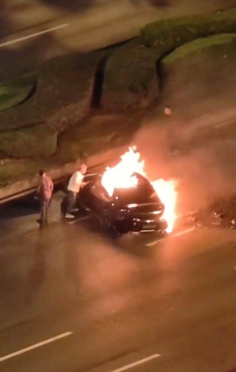 车辆起火后,一名白衣男子肘击驾驶位玻璃试图救出司机。图片来源/视频截图