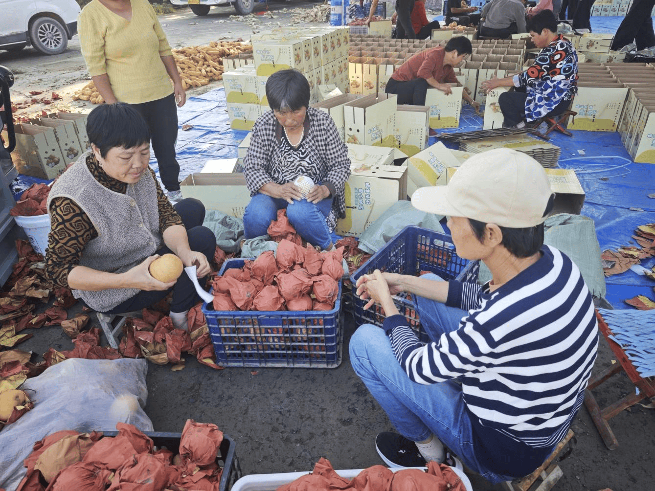 河南省台前县清水河乡王庄村秋月梨种植园内,村民们把采摘的秋月梨打包装箱(濮阳市委宣传部供图)