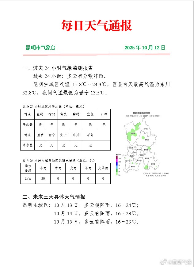 昭通市、曲靖市、昆明市、楚雄州东部、玉溪市东部、文山州南部、红河州东南部、普洱市、西双版纳州、临沧市南部、德宏州北部、保山市北部、大理州西部、丽江市南部、怒江州南部多云有阵雨局部中雨,其他地区多云。