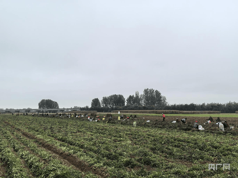 驻马店花生收获现场则上演“人机接力”。“收割机不够,无法下田,就去信阳等地找人来薅花生,一天工钱一二百。” 农民赵先生说,当地花生收获后,村民把花生头朝上摆放以防发芽。