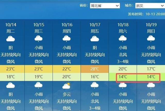 大转折就在本周末,17日(周五)夜间至19日(周日),受较强冷空气影响,武汉还有一次大风降温和降雨过程,全市小到中雨、局地大雨,伴有4-5级偏北风,阵风6-8级,最高气温降至20℃以下,最低气温降至15℃以下。