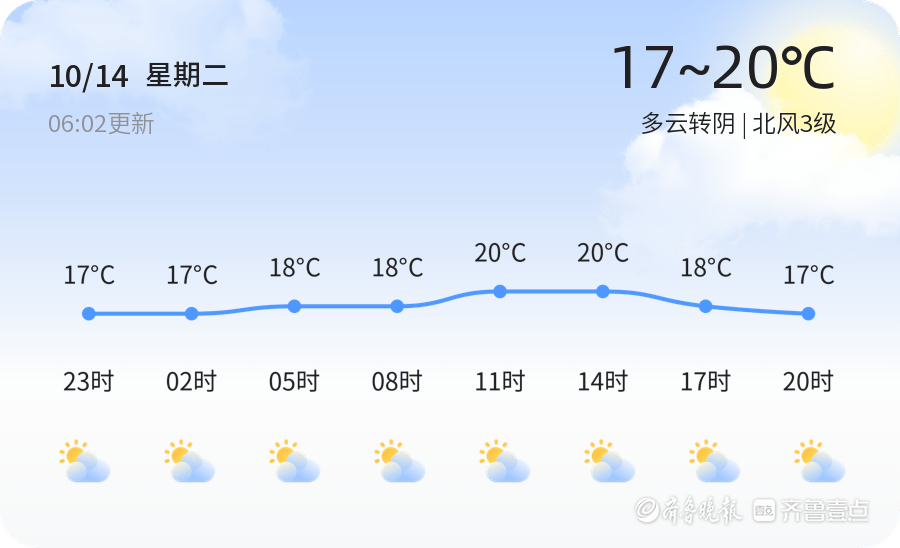 今天是10月14日,星期二,农历八月廿三。烟台市今日天气多云转阴,气温在17℃至20℃之间,北风3级,空气湿度79%,PM2.5浓度为22,空气质量状况为优。今天的天气较为舒适,但市民出行时仍需注意防风保暖。建议市民在早晨和傍晚时段减少外出,以免受凉。