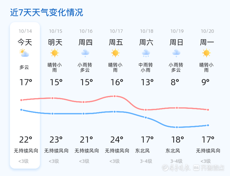 今天是10月14日,星期二,农历八月廿三。临沂市天气多云转晴,气温在17℃至22℃之间,目前气温为13.4℃,西北风1级,空气湿度为91%,PM2.5指数为39,空气质量良好。全市各区天气情况基本一致,均为多云转晴,气温平稳,适合户外活动。