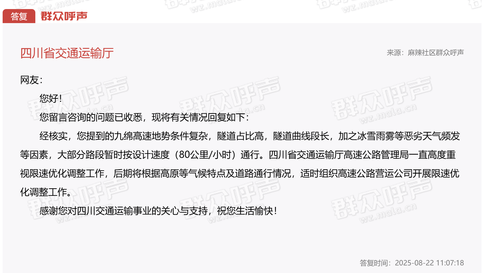 针对网友的建议,九寨沟县委网信办回复称,九绵高速公路设计时速为80公里/小时,针对限速问题,绵九公司已会同相关各方开展优化限速的相关工作,国庆节后将按照批复的优化方案进一步完善。