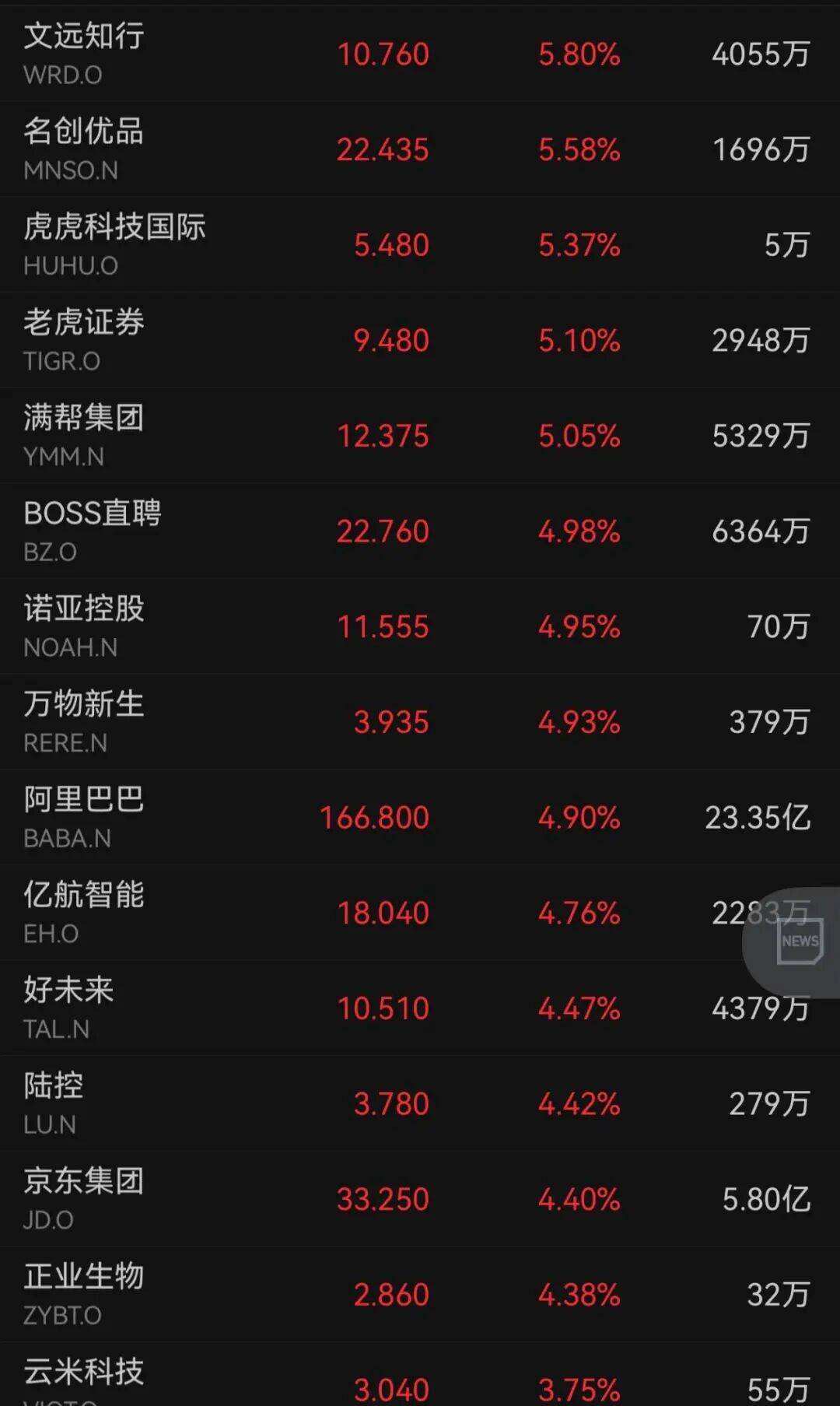 无忧英语、MICROALGO和世纪互联均涨超10%;中概互联网板块中,阿里巴巴、京东分别上涨4.90%、4.40%。