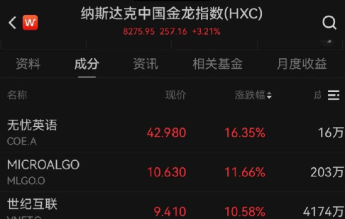 热门中概股普涨,纳斯达克中国金龙指数收涨3.21%。