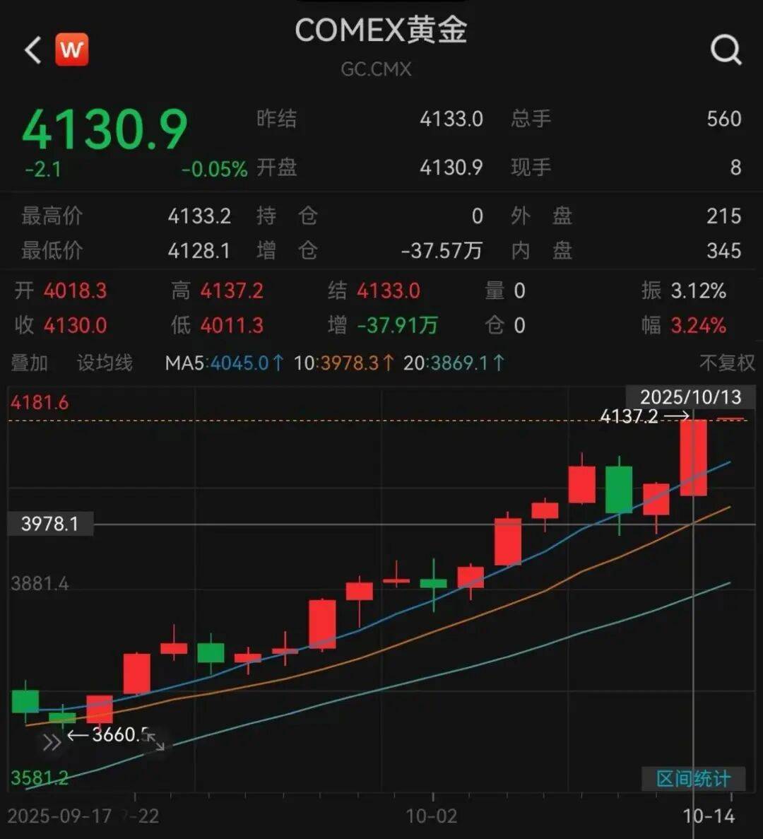 国际黄金和白银延续涨势。周一,COMEX黄金收涨3.24%,报收于4130美元/盎司,再创新高。盘中点位最高突破4137美元/盎司。