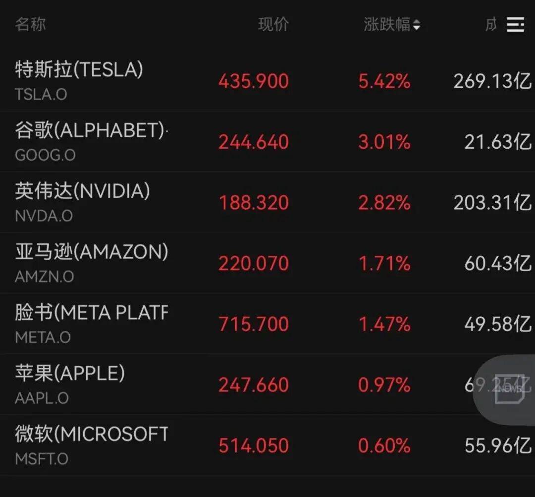 美股科技“七巨头”普涨,特斯拉上涨超5%,谷歌、英伟达和亚马逊分别上涨3.01%、2.82%、1.71%。