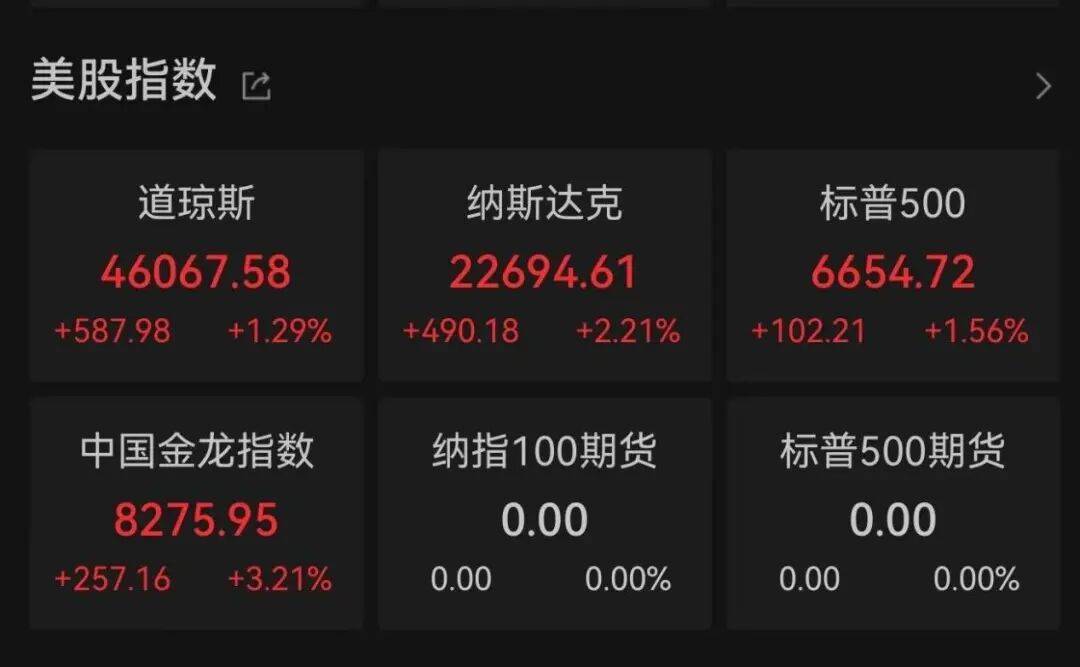截至收盘,道琼斯工业指数上涨1.29%,报46067.58点;纳斯达克指数上涨2.21%,标普500指数上涨1.56%。