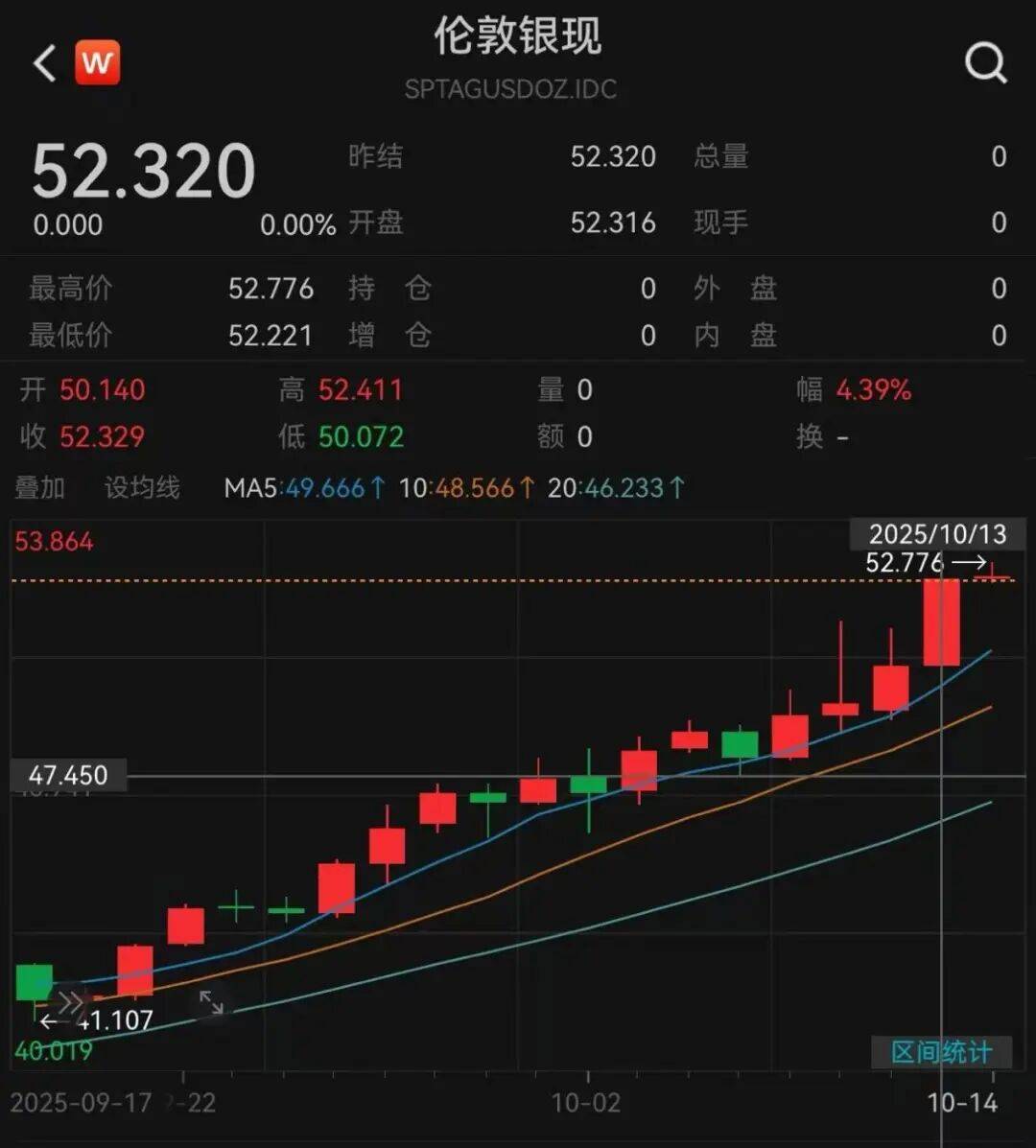 市场对伦敦银流动性枯竭的担忧不断升温。伦敦银现涨4.39%,报收于52.33美元/盎司。