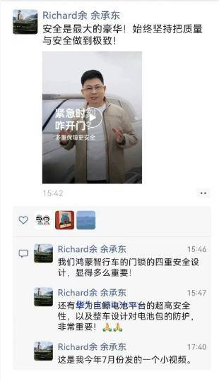 余承东在评论区表示:“我们鸿蒙智行车的门锁的四重安全设计,显得多么重要!还有华为巨鲸电池平台的超高安全性,以及整车设计对电池包的防护,非常重要!”