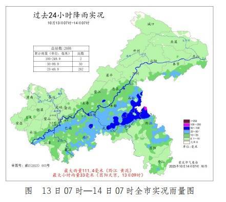 13日07时—14日07时,我市各地阵雨,长江以南地区中到大雨,局地暴雨到大暴雨;黔江的2个雨量站大暴雨,涪陵、丰都、武隆、彭水、石柱、黔江等6个区县的50个雨量站暴雨,最大雨量111.4毫米(黔江黄泥);最大小时雨量33毫米(酉阳天京,13日09时)。气温14~25℃。