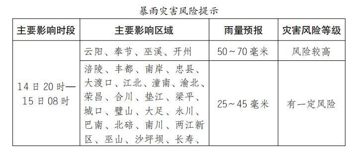 10月14日8时,重庆市气象台发布消息,预计未来一周我市多降雨,14日夜间,中西部和东北部地区中到大雨(15~45毫米),局地暴雨(50~70毫米);16—17日,大部地区仍有强降雨,累计雨量40~90毫米,局地120~150毫米。东部地区累计雨量较大,叠加前期降雨影响,注意防范中小河流洪水、山洪、滑坡、泥石流、崩塌、城乡积涝等次生灾害。