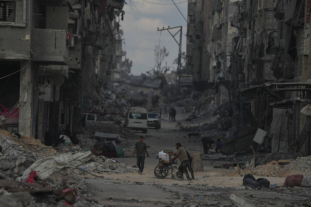 当地时间2025年10月12日,加沙城,以色列和哈马斯同意暂停战争并释放剩余人质后,巴勒斯坦人推着装载物品的手推车返回家园。视觉中国 图