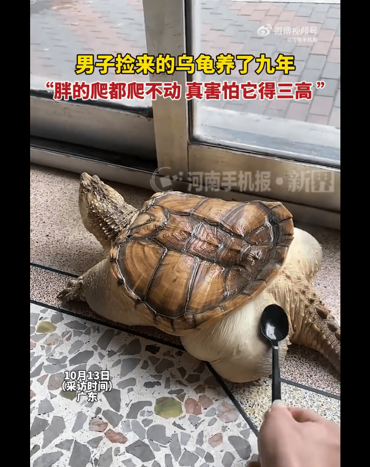 男子捡来的乌龟养了9年胖到爬不动,“胖得爬都爬不动,真害怕它得三高”