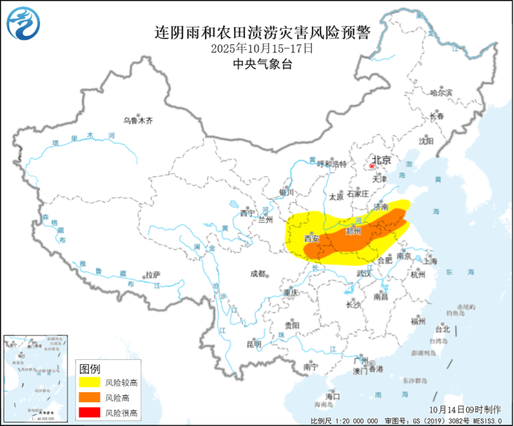 预计10月15—17日,陕西中南部、华北西南部、黄淮、江汉等地将有中到大雨,局地有暴雨,甘肃陇东、陕西中南部、山西西南部、河南大部、山东中南部、江苏北部、安徽北部、湖北北部等地连阴雨和农田渍涝风险较高(黄色预警),其中陕西东南部、河南中部、山东南部、湖北西北部、江苏北部和安徽北部部分地区风险高(橙色预警)。建议上述地区避雨抢收,采取通风存储、烘干等措施,降低发芽霉变风险;及时排涝降渍,腾茬整地,适时适墒播种。
