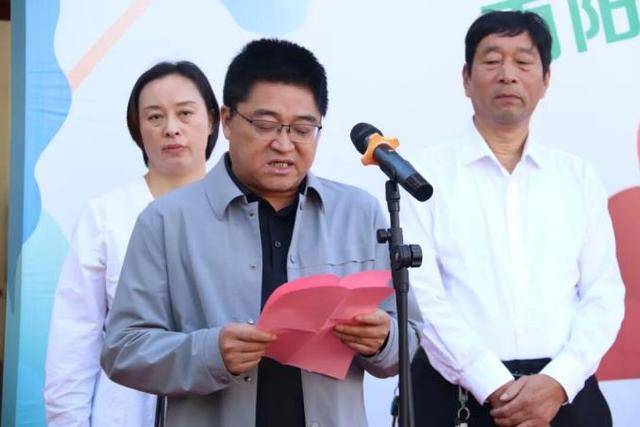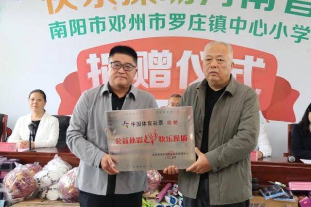 河南省体育彩票管理中心郑州东区分中心负责人向学校授予“公益体彩 快乐操场”牌匾,新郑市郭店镇五里堡完全小学校长曹仲谦则代表全校师生回赠了锦旗。