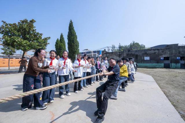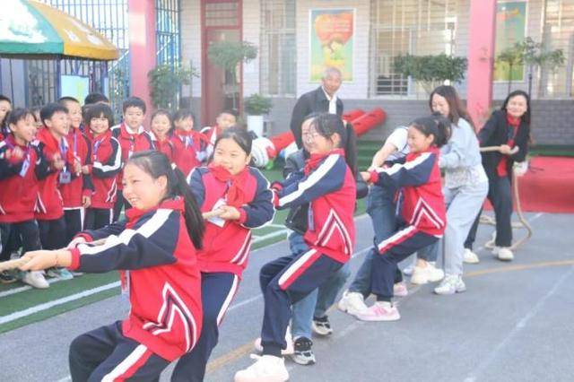 操场上,拔河比赛的呐喊声此起彼伏。孩子们双手紧握绳子,身体后倾、双脚用力蹬地,在助威声中全力拼搏。绳中央的红色标志带在两队之间来回移动,欢呼声与口号声交织成一片欢乐的海洋,让孩子们在协作中体会到运动的魅力。