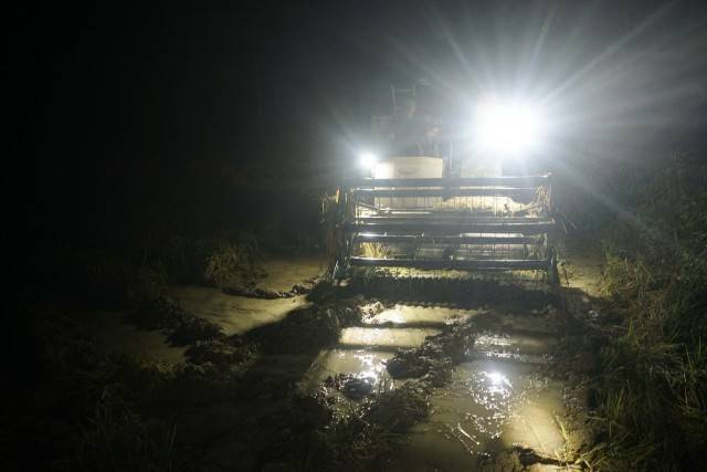村里一位开收割机的师傅,有时下午两点才吃上午饭。有时,到晚上十一二点,收割机还在田里熬夜,机顶照明灯像萤火虫一样,在漆黑一片的田野闪烁着,等待颗粒归仓的农民和载货的拖拉机也都陪在一旁。