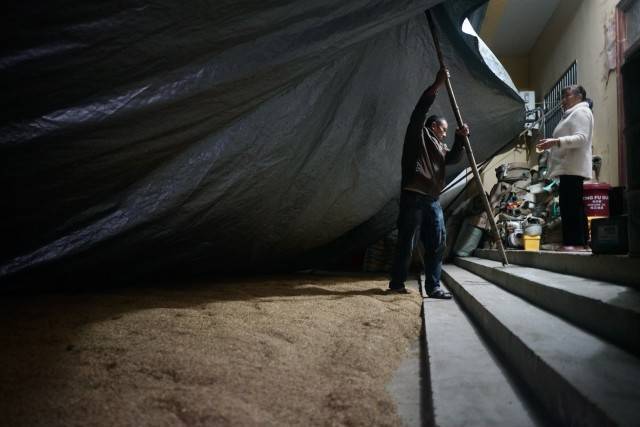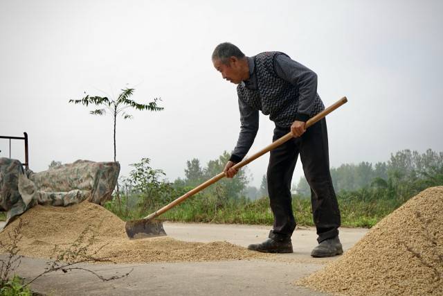 他们频繁地看天气预报,见缝插针地四处晾晒——院子里、房顶上、公路旁、广场上。许多农民在院子内外都搭起遮雨棚,雨停就掀开晾,雨来就盖上,有地方漏水,就拿出家里大大小小的盆接着。把粮食堆在屋里的,有的搬出风扇吹,有的在家中烧一盆火。