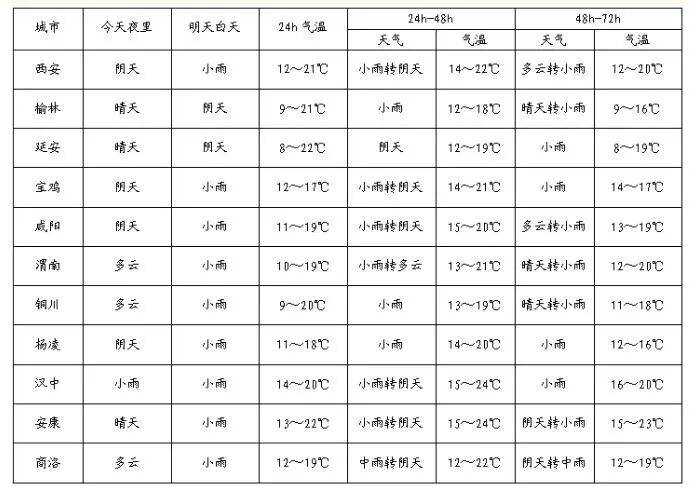 10月21日:陕北、关中东部多云,关中西部、陕南南部有分散性小雨或阵雨(0.5~10毫米)。
