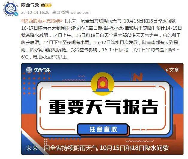 10月16日:全省大部有小雨(0.1~10毫米),关中南部山区、陕南部分地方有中雨(10~25毫米),汉中东部局地、安康北部局地、商洛东部局地有大雨(25~45毫米)。陕北、关中北部有5级(8~10.8米/秒)偏北风,阵风可达6级(10.8~13.9米/秒)以上。